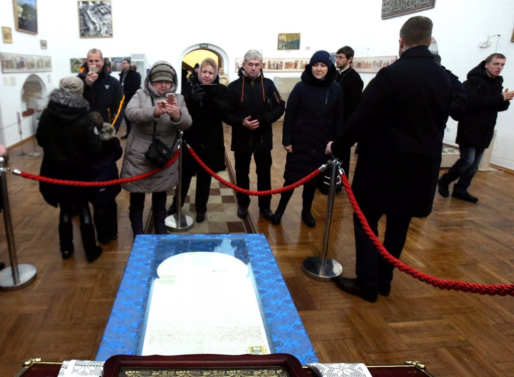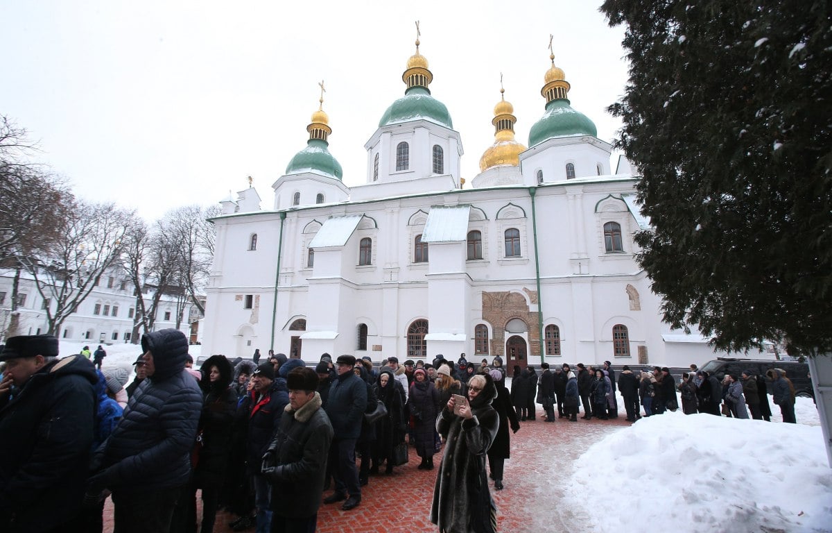 Черга з вірян, які бажають подивитись на Томос. Архівне фото: УНІАНДемонстрація Томосу у Софійському соборі. Архівне фото: УНІАН