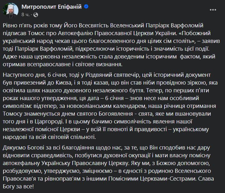 "Тепер, по перших п՚яти роках нашого утвердження, ця дата — 6 січня — знов несе нам особливий символізм: відтепер, за новоюліанським календарем, наша річниця отримання Томосу знаменується днем святого Богоявлення — свята, яке ми вшановували того дня і в Царгороді. І в цьому бачимо символічність явлення нашої незалежної помісної Церкви — у всій її повноті й правдивості — українському народові та всій світовій спільноті", — написав Владика сьогодні у Facebook.