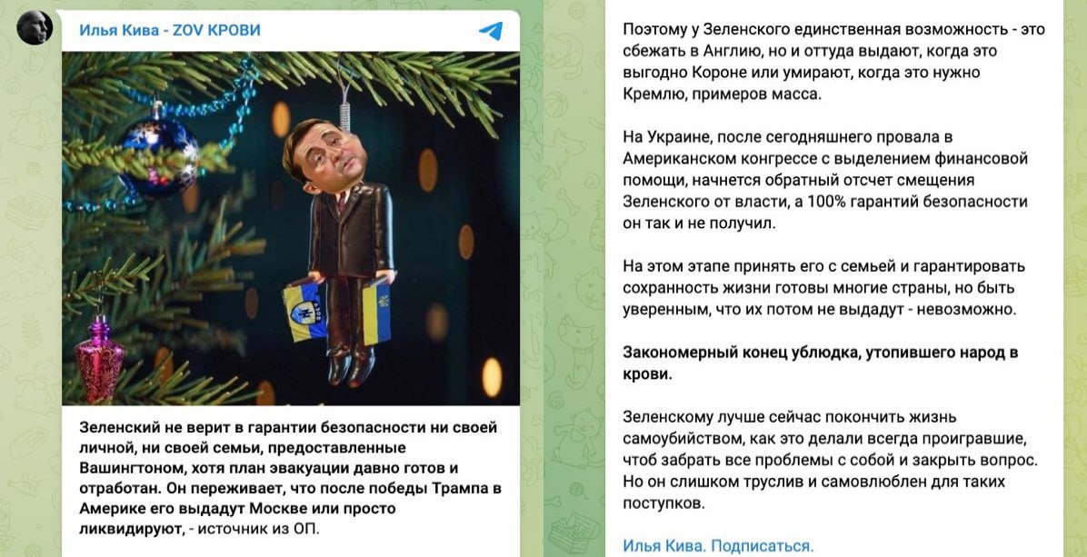 Сегодня предатель Илья Кива в своем телеграмм-канале опубликовал последний пост. Покойник призвал Зеленского "покончить с собой, чтобы забрать все проблемы с собой".